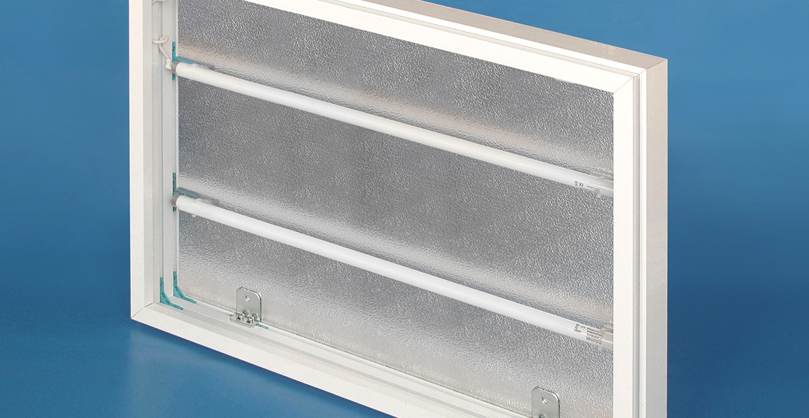 O espelhado brilhante aumenta a intensidade da luz e homogeneidade da sua difusão dentro da caixa, permitindo obter grafismos e imagens vibrantes em cor e vivacidade