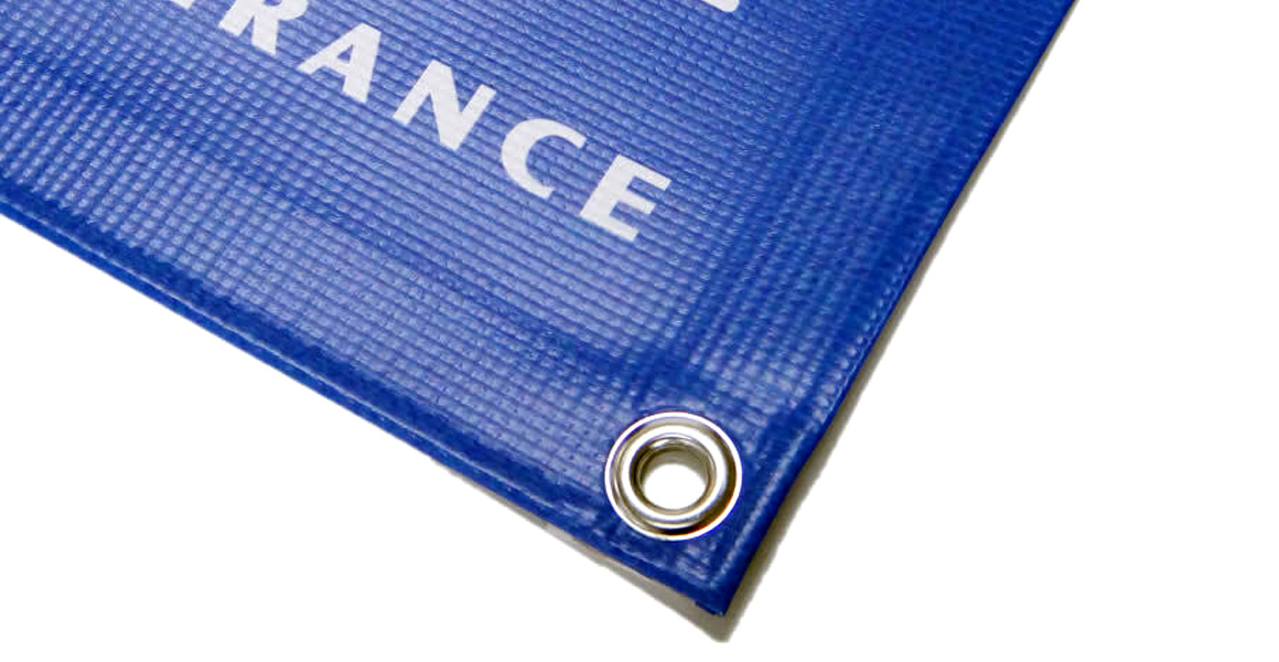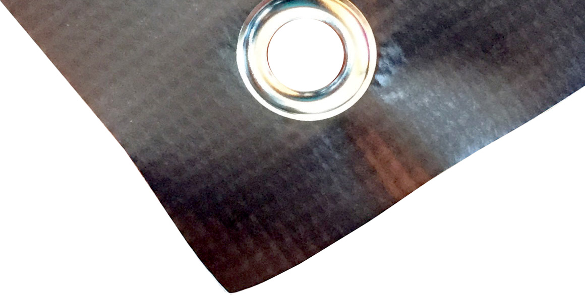 Lona pré-confeccionada com medidas standard e acabamento de ilhós + bainha.