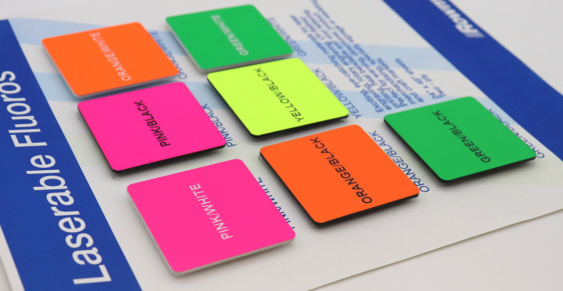 Placas em acrílico laminado, de impacto modificado, com cores fluorescentes, graváveis através de equipamentos a laser ou CNC e imprimíveis por impressoras UV. Cores apelativas, concebidas para sinais direcionais, merchandising de produtos, sinalização especializada, decoração de eventos festivos e artesanato. Disponível em 7 cores com acabamento mate sem brilho, tornando-a perfeita para aplicações interiores e exteriores.